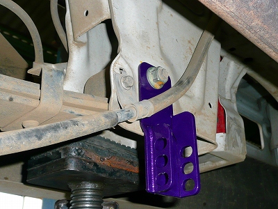 リーフアンダーバーのブラケットを、リーフスプリング取付けナット部に装着し、サイドブレーキケーブルを固定します。