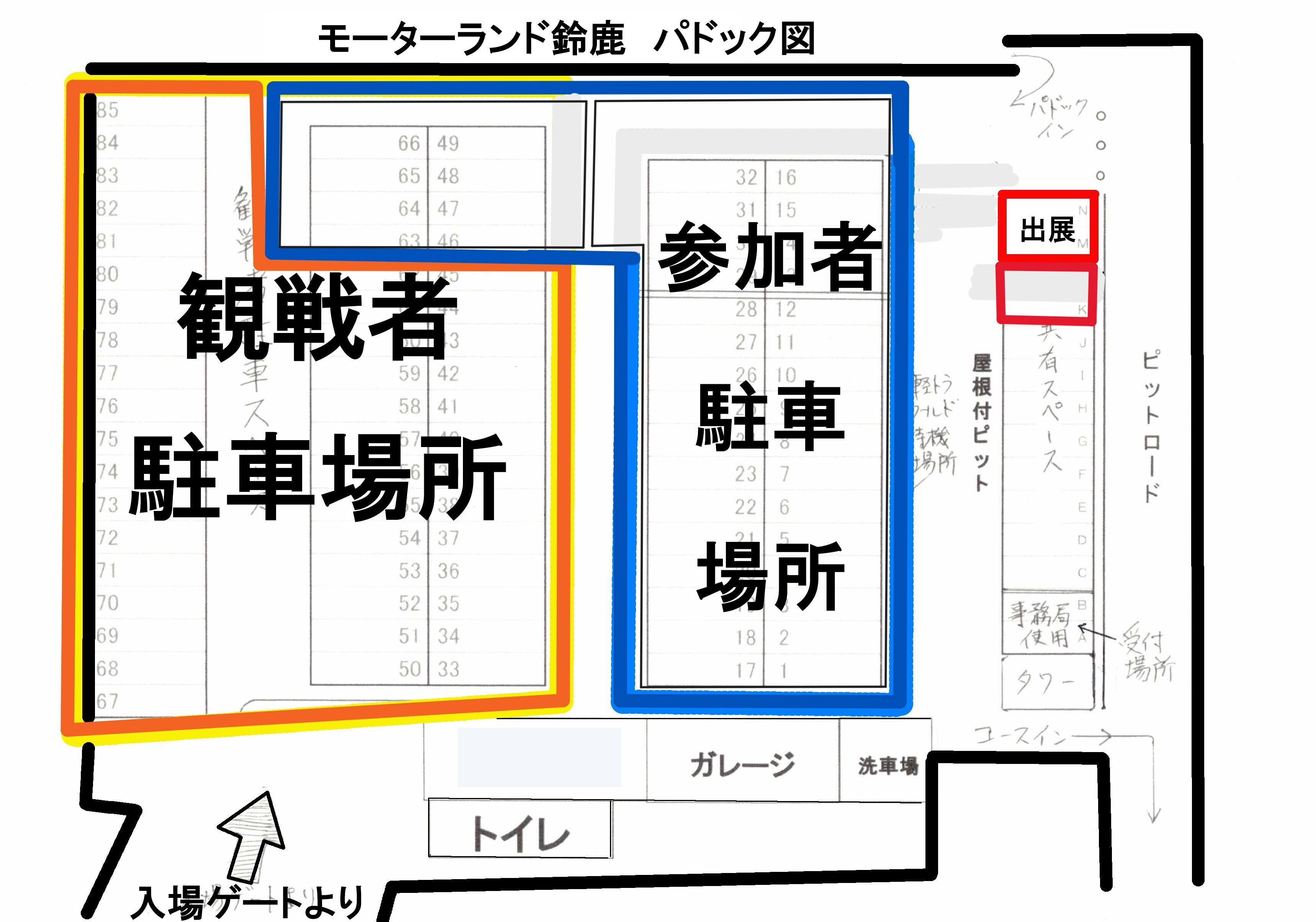 右半分および屋根付ピットは参加者・関係者の指定利用場所ですので、車両での進入および駐車はご遠慮ください。